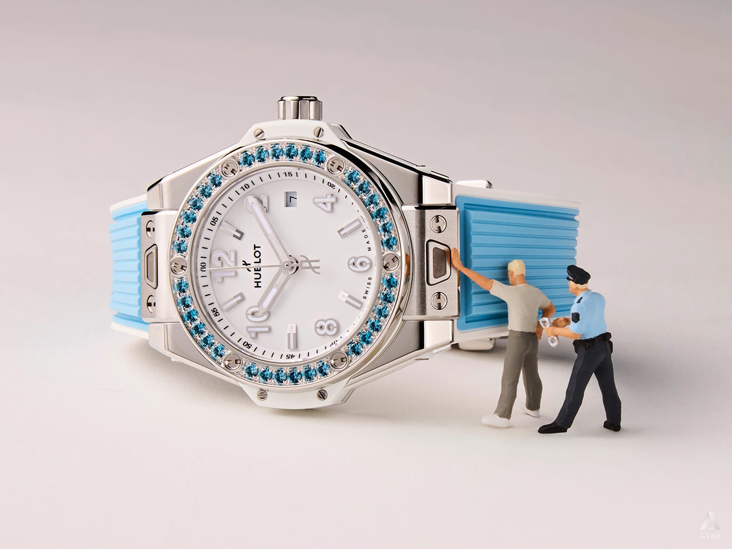 The Big Bang One Click Joyful sports a glossy white dial, adorned with the Big Bang’s signature alternating Arabic numerals and applied indexes to mark the hours. The watch is powered by the HUB1120 self-winding movement with a power reserve of 40 hours.