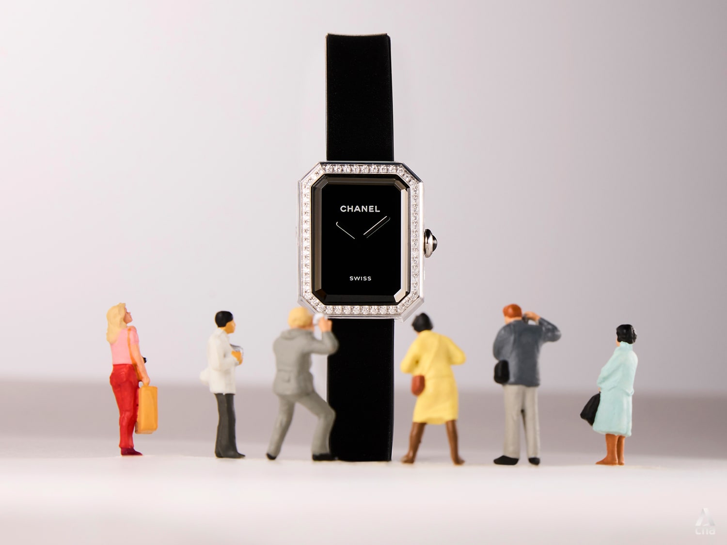 Inspired by Chanel dress designs, the house first created the first velvet-touch version of the Premiere watch strap in 2019, its soft, ribbon-like texture wrapping gracefully around the wrist. The Chanel Premiere Ribbon watch was introduced in 2023, featuring a steel case set with 52 brilliant-cut diamonds that enhances the intense black of the dial. Powered by a quartz movement, the miniature marvel measures just 19.7mm by 15.2mm, giving the watch a delicate yet striking presence.