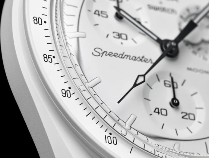 The latest collaboration is officially called Mission to the Moonphase. It’s an all-white timepiece with white dial, white Bioceramic case, white bezel insert and white Velcro straps. This is also the most complicated MoonSwatch to date – it features a moon phase as one of the chronograph functions, a Swatch first.