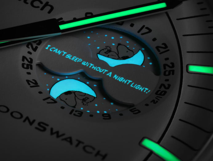 All the action on the Mission to the Moonphase happens at the subdial at 2 o' clock. Here, Snoopy is lying on the moon with his bestie Woodstock on his lap. When the lights go out, a hidden quote from the Snoopy comic strips is revealed under UV light, which reads “I can’t sleep without a night light!” The quote is a reference to the limited-edition Omega Speedmaster Silver Snoopy released in 2015, which had a quote that said “Failure is not an option”.