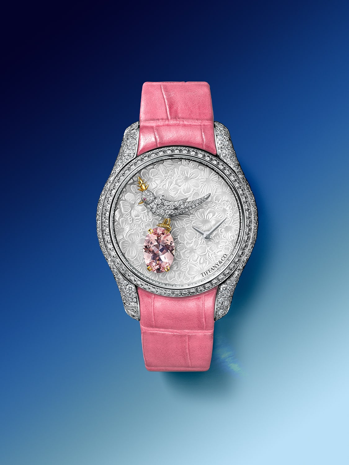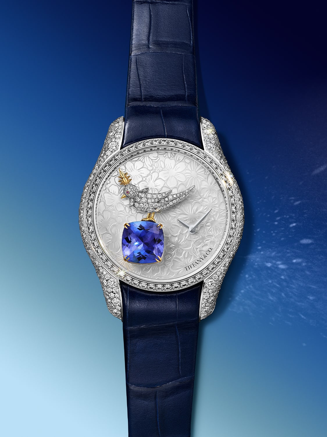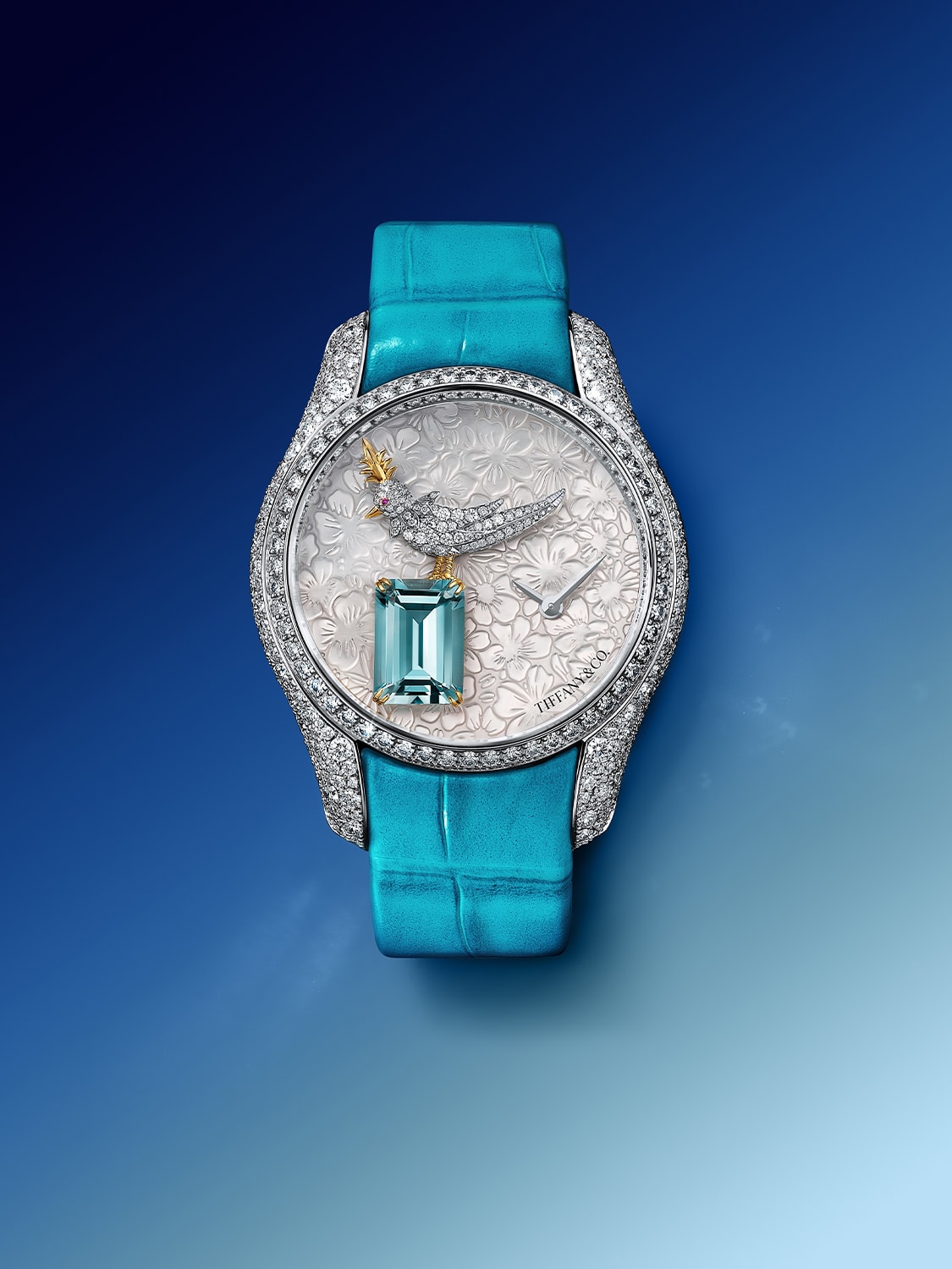 In all, the Bird on a Rock Legacy watch is set with a total of 587 diamonds of 3.6 total carats. The 309 diamonds on the case are complemented by 116 diamonds on the bezel, dial and flange. A sprinkling of diamonds highlights the engraved sunburst pattern on the caseback and the signature T buckle fastening the alligator strap is set with 43 round brilliant diamonds. The watch is powered by a high-precision quartz movement.