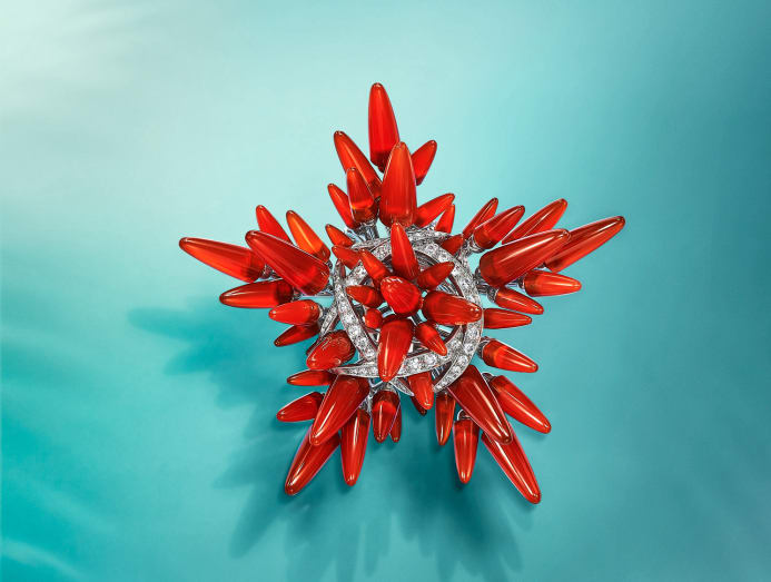 The first Blue Book collection to be designed by chief artistic officer of jewellery and high jewellery Nathalie Verdeille (she joined the House in September 2021), the collection centres around the question of how Schlumberger would approach the subject today. The answer is perhaps best embodied by the new Sea Anemone theme: The 18th-century en tremblant technique (where elements of the design are mounted on wire-coil springs so that they tremble with the slightest movement) is used alongside inverse gem settings (a gem’s table facet faces down and the culet faces up) to lend movement and texture to the invertebrates. The Sea Anemone creations also spotlight a stone that Schlumberger had no chance to delight in: Blue cuprian elbaite tourmalines, which were only discovered in 1989, two years after the designer’s demise.