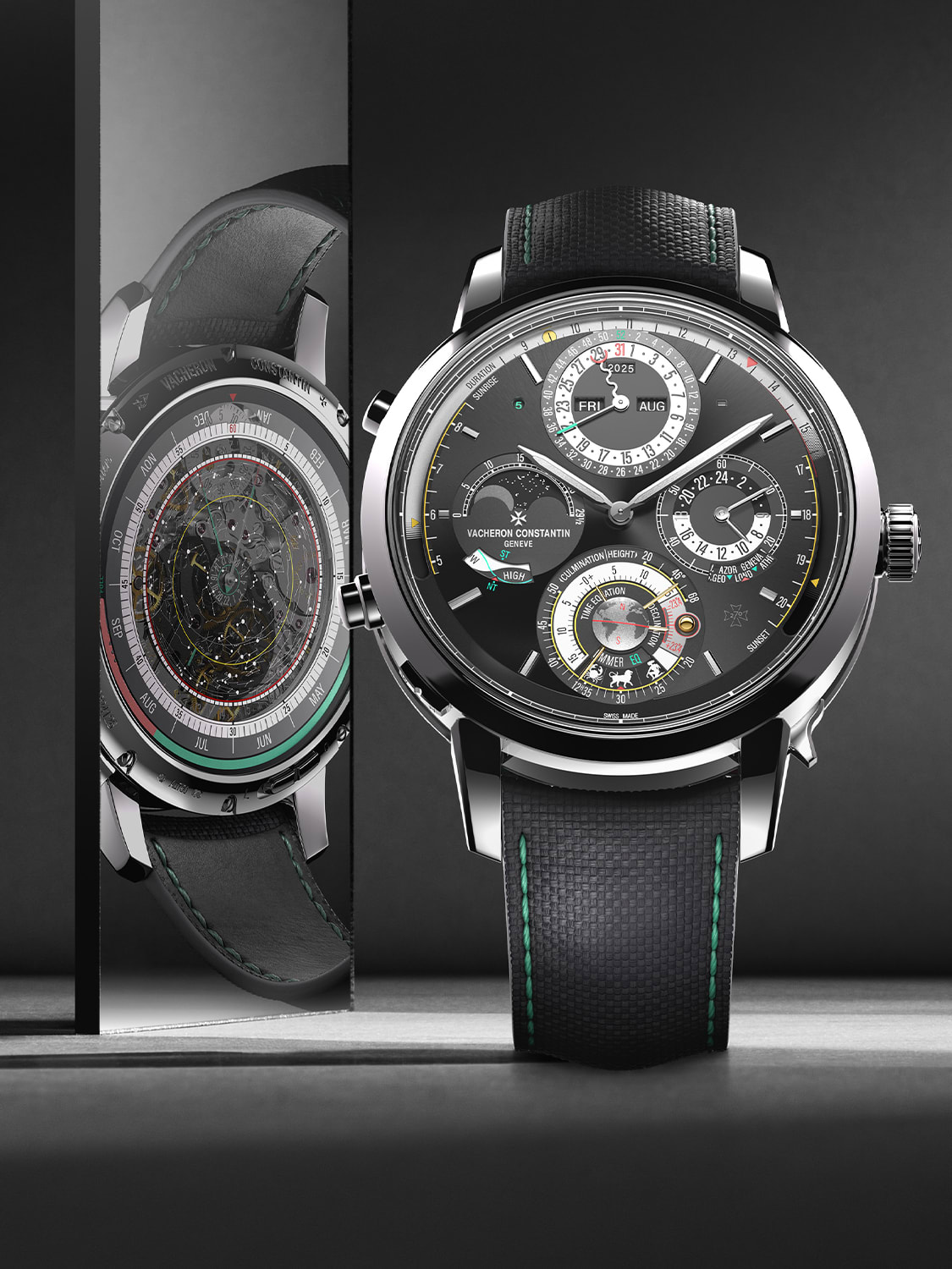 Despite its encyclopaedic complication count, the Solaria remains highly legible. Its front dial features four counters, two of which carry up to five functions each, arranged for clarity with a contrast-enhancing palette of black, white, and grey. The reverse side, which is dominated by the star chart and split-seconds chronograph, maintains visual balance through the thoughtful use of colour-coded indicators, notably red and green chronograph hands and a fuel gauge–style power reserve indicator.