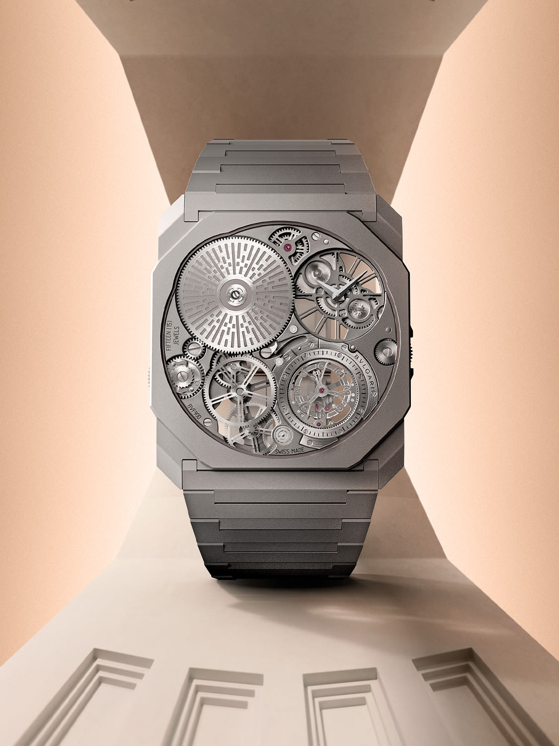 Aesthetically, the 40mm case stays true to the Octo Finissimo’s signature monochromatic grey palette and distinctive geometric silhouette. A microbead-blasted titanium bezel, case middle, and lugs accentuate the geometric profile, while a circular-grained steel ratchet engraved with geometric motifs adds visual intrigue and depth. An integrated microbead-frosted titanium bracelet – just 1.5mm thick, including the clasp – seamlessly completes this masterpiece.