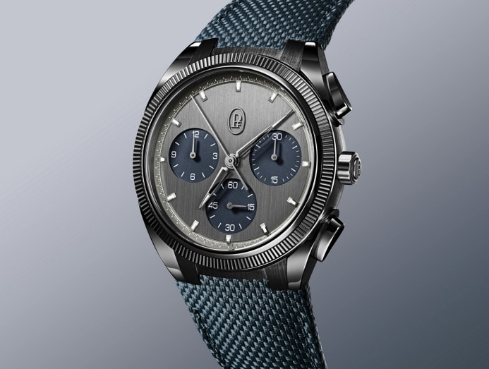 A total of 72 components – from the case, fluted bezel, crown and pushers to even the pin buckle – are fashioned from this material that took three years to perfect. The dial is coated in Blackor, a 9k gold-nickel alloy that lends it a distinctive grey-black hue, which beautifully enhances the timepiece’s metallic sophistication. Offered in two 42.5mm references of Milano Blue and London Grey, both chronographs feature matching subdials and textured rubber straps for a chic look.