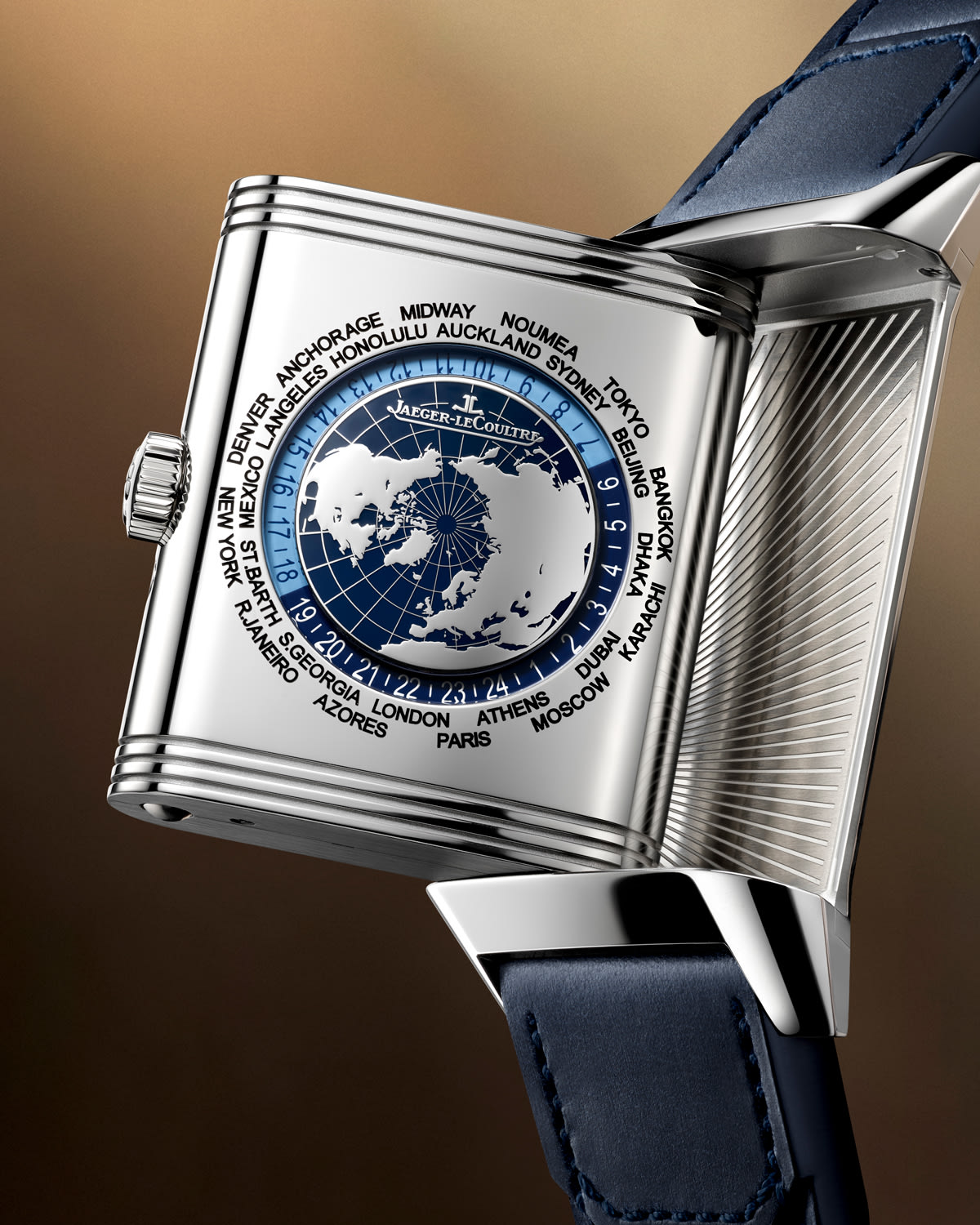 The visual drama, as is often the case for complicated Reversos, is on the other side. A laser-ablated world map, complete with engraved meridian lines and 141 tiny hollows filled with lacquer to represent the oceans, takes centre stage. Encircling the map is a 24-hour ring followed by a fixed ring of engraved city names. Most worldtimers rotate the city ring, but the Reverso Tribute Geographic instead lets you jump the 24-hour disc forward by one-hour increments using a hidden pusher at the top of the case.