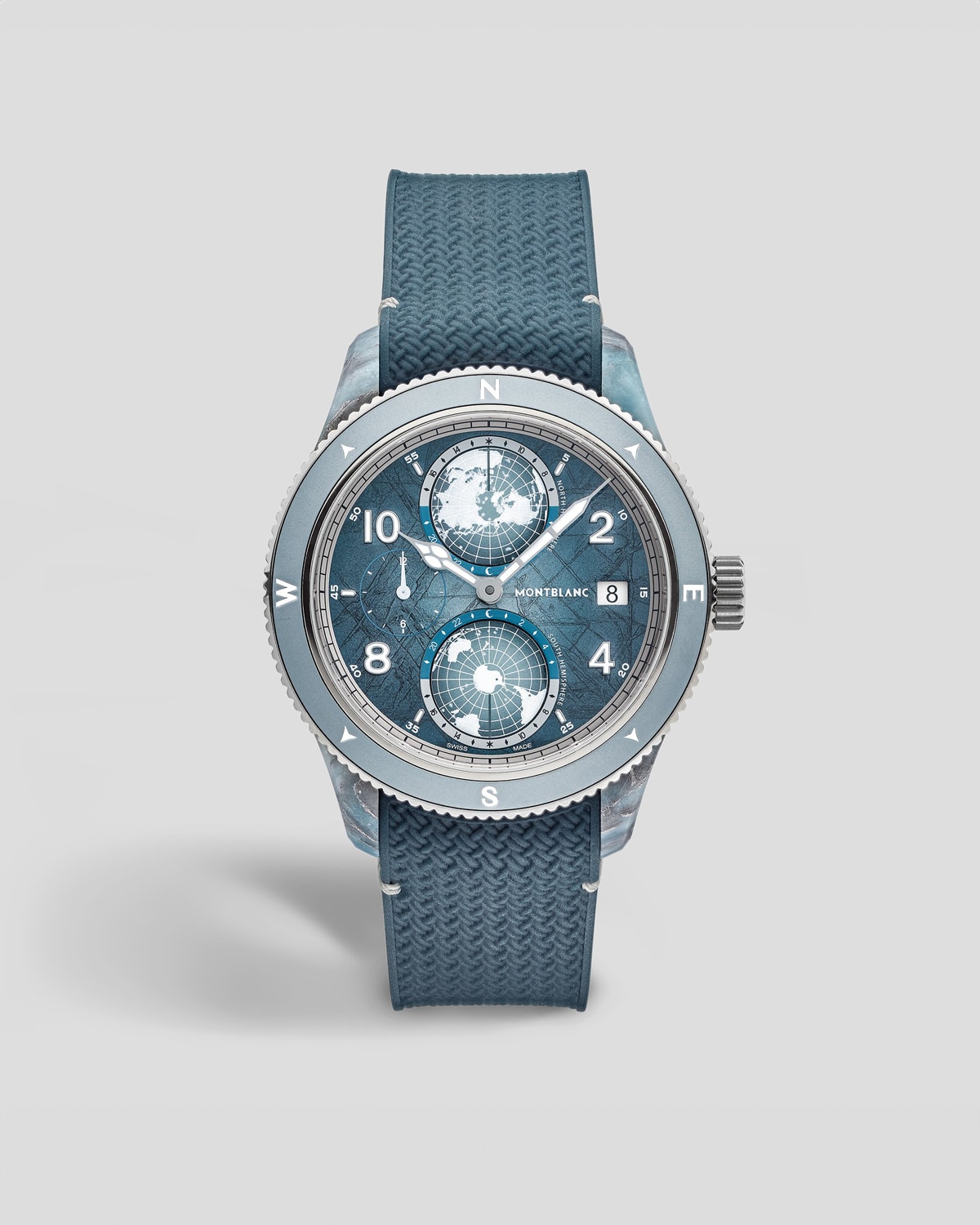 This year’s edition honours Montblanc ambassador Reinhold Messner and his 1986 ascent of Mount Vinson in Antarctica, the final leg of his Seven Summits quest. Limited to 986 pieces, the 43.5mm by 13mm case is crafted largely from titanium, with a grey anodised aluminium bezel insert. But the mid-case is what stands out: A composite of quartz fibres, aluminised basalt fibres, calcium carbonate, and pale blue resin, designed to evoke glacial crystal formations. On the left side of the case is an outline of Mount Vinson — cleverly treated to glow blue in the dark.