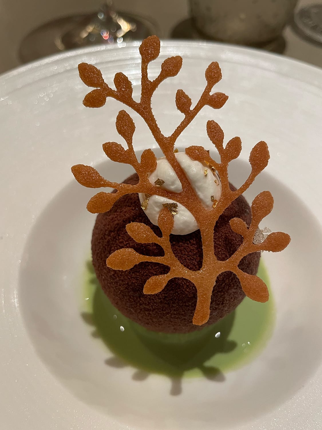 There was a disc of tuna tartare with gochujang, osetra caviar and dots of Asian pear gel; ultra-tender galbi-jjim with a wedge of ginseng-infused Pommes Anna (sliced, layered potatoes), jujube and parsnip purees and a dusting of perilla powder.