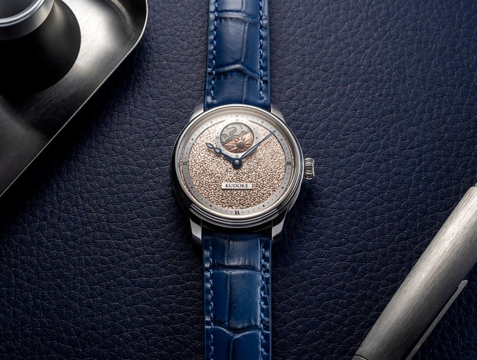 Exceptions have been made for special partners and occasions, though. Sincere Fine Watches, the exclusive distributor for Kudoke in Singapore and Malaysia, recently released a 20-piece limited Kudoke 2 SHH Edition to celebrate the watchmaker’s 20th anniversary. The model, which offers hours, minutes, and a beautifully engraved 24-hour day/night indicator at 12 o’clock, gets a “flakes” dial in a “champagne rose” hue. That crystalline texture is painstakingly carved out by hand, and then electroplated in silver and gold before getting a rose-tinted transparent lacquer coating. This flakes finishing was first seen in the Kudoke 3 Flakes, but this will be the first and last time this shimmering finish will appear in a Kudoke 2.