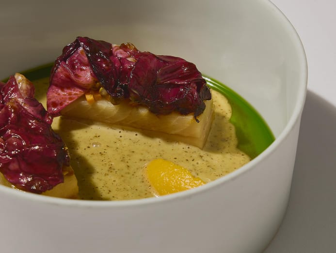 Grown by the Karen tribe of Le Tor Glor in the hills of Thailand’s Tak province, the bai tong hom looks like white pandan leaves. “We dry it over the fire to give it a smoky flavour and bring out the deep umami notes,” Riehn explained. This goes into a beurre blanc served with a main course of local trout.