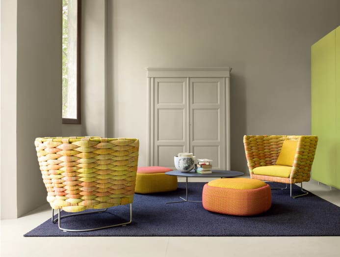 In another example, she conceived of the Metamorfosi collection, which gives new life to material remnants from the factory. Designed by Brazilian designers Fernando and Humberto Campana, it comprises five seats and a rug, made by hand at the social project CouLture Migrante in Como that offers job opportunities to migrant men and women at risk of social exclusion.