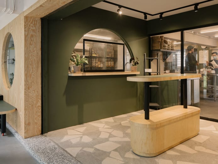 When chef Chris Kong wanted to create a shop to cement his flourishing granola online business, he engaged Dean Chew of Drawn. Friendly arches as well as mustard and seaweed green tones echoing the Everton HDB shop’s architecture anchor it intimately to its locale. Circular portals provide views both ways.
