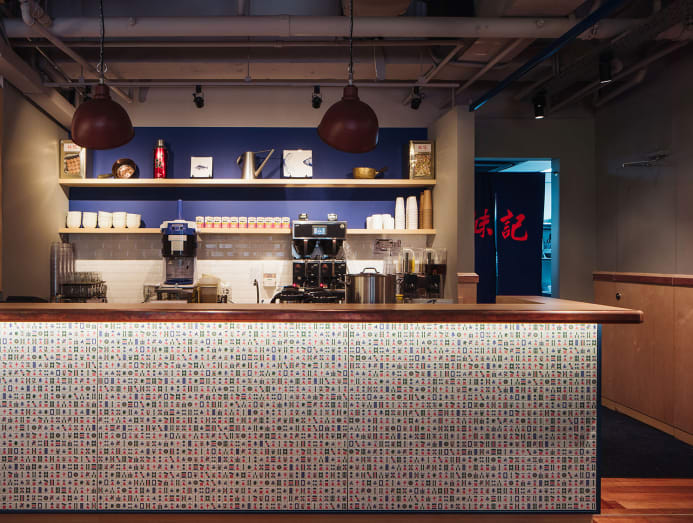 For Mui Kee, a third-generation brand from Hong Kong serving congee, a facade of rusty panels, industrial mesh and neon red signage channels the Bladerunner film set while inside, mahjong tiles wrapping the counter has a distinctively Hong Kong feel.