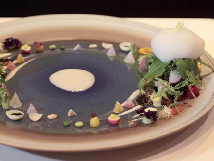 The inspiration led him to create his own signature dish Chikyu (planet Earth), a dish representing the land and sea with 110 different vegetables, grains and herbs plated in a circle, and embellished with shellfish foam. He narrated: “There are mountains and clouds. As the clouds hit the mountains, the rain falls, and it becomes [fresh] water. The water becomes the river and runs… through the earth. It runs into the ocean… evaporates to become clouds – it is all a cycle.”