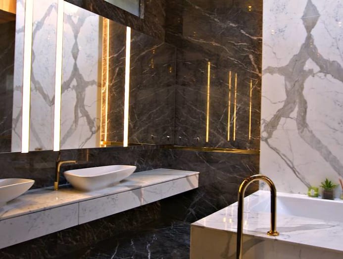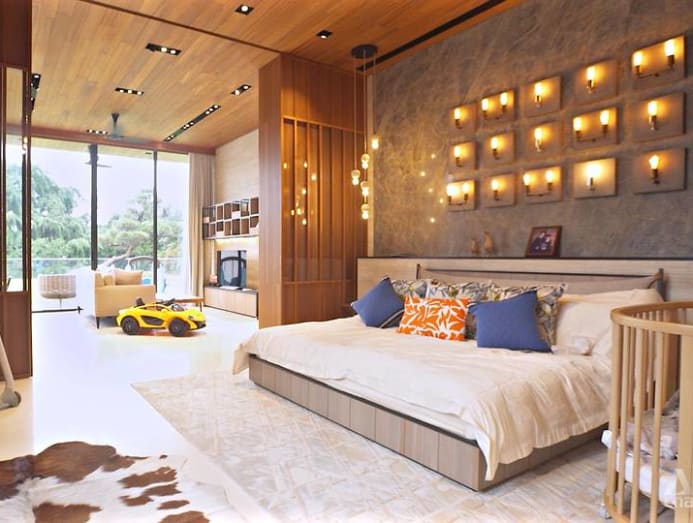 In the ensuite bathroom is a striking bookmatched marble feature wall with a symmetrical pattern of two hearts and a diamond. It is meaningful to his wife, said Lim, as it connotes a Chinese idiom of two persons having mutual rapport with each other.
