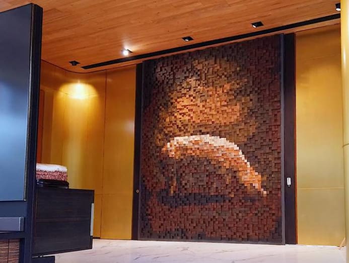 The design and fittings were made to pay homage to Lim’s familial and cultural heritage. The handles on the foyer door form the family name “Lin” in Mandarin, and there is an art relief using nearly 4,500 blocks of timber in eight different shades to commemorate the family’s humble background in pig farming.