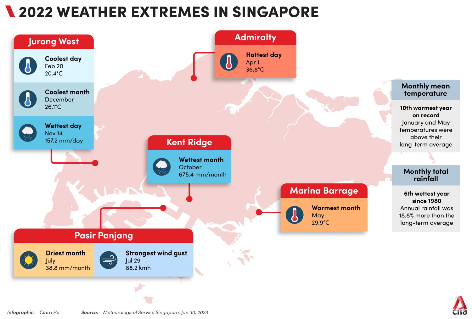 Despite the wetter conditions, Singapore’s annual mean temperature in 2022 was the 10th highest since temperature records began in 1929.