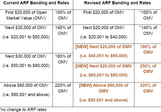 For vehicles with an OMV above S$40,000 to S$60,000, the revised ARF rates will be 190 per cent. And vehicles with an OMV above S$60,000 to S$80,000 will be charged an ARF rate of 250 per cent.
