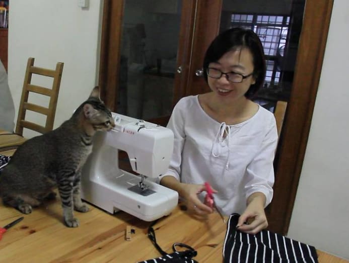 A look around her Woodlands flat reveals evidence of her creative flair: A desk chair has been reupholstered with covers made out of an old pair of jeans. Her cat is curled up on a picnic blanket made out of scrap material from discarded clothes. And a mannequin displays a halter top made out of what used to be a pair of trousers.