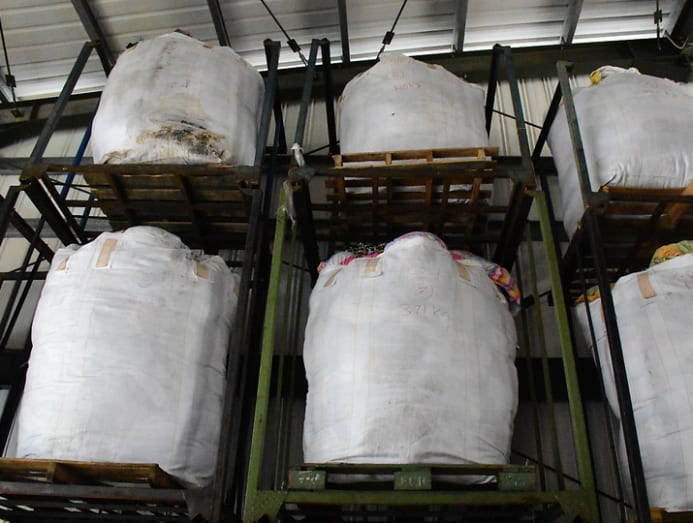 Jumbo bags of donated clothes are prepared for export at the Salvation Army's central processing centre. Each bag holds about 400kg. (Photo: Winnie Goh)