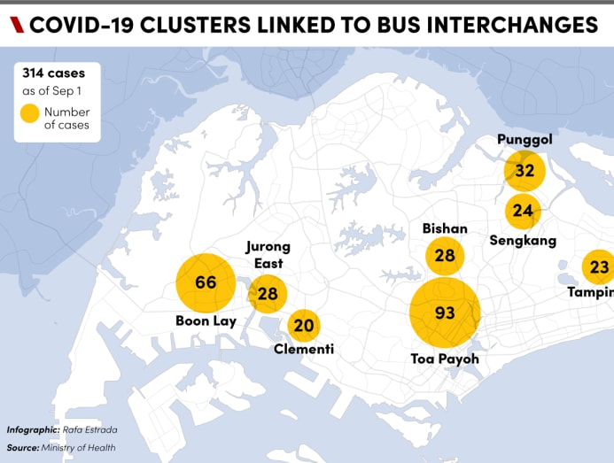 As of the Health Ministry's update on Wednesday night, a total of 314 COVID-19 cases have been linked to clusters at eight bus interchanges – at Tampines, Boon Lay, Jurong East, Toa Payoh, Bishan, Punggol, Clementi and Sengkang.