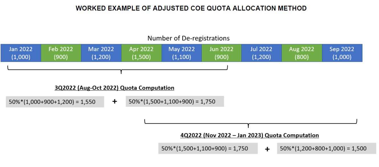Under the current system, the quota of COEs available for bidding in each quarter is primarily based on the number of vehicles deregistered in the previous quarter, with a one-month lag time for processing and computation.