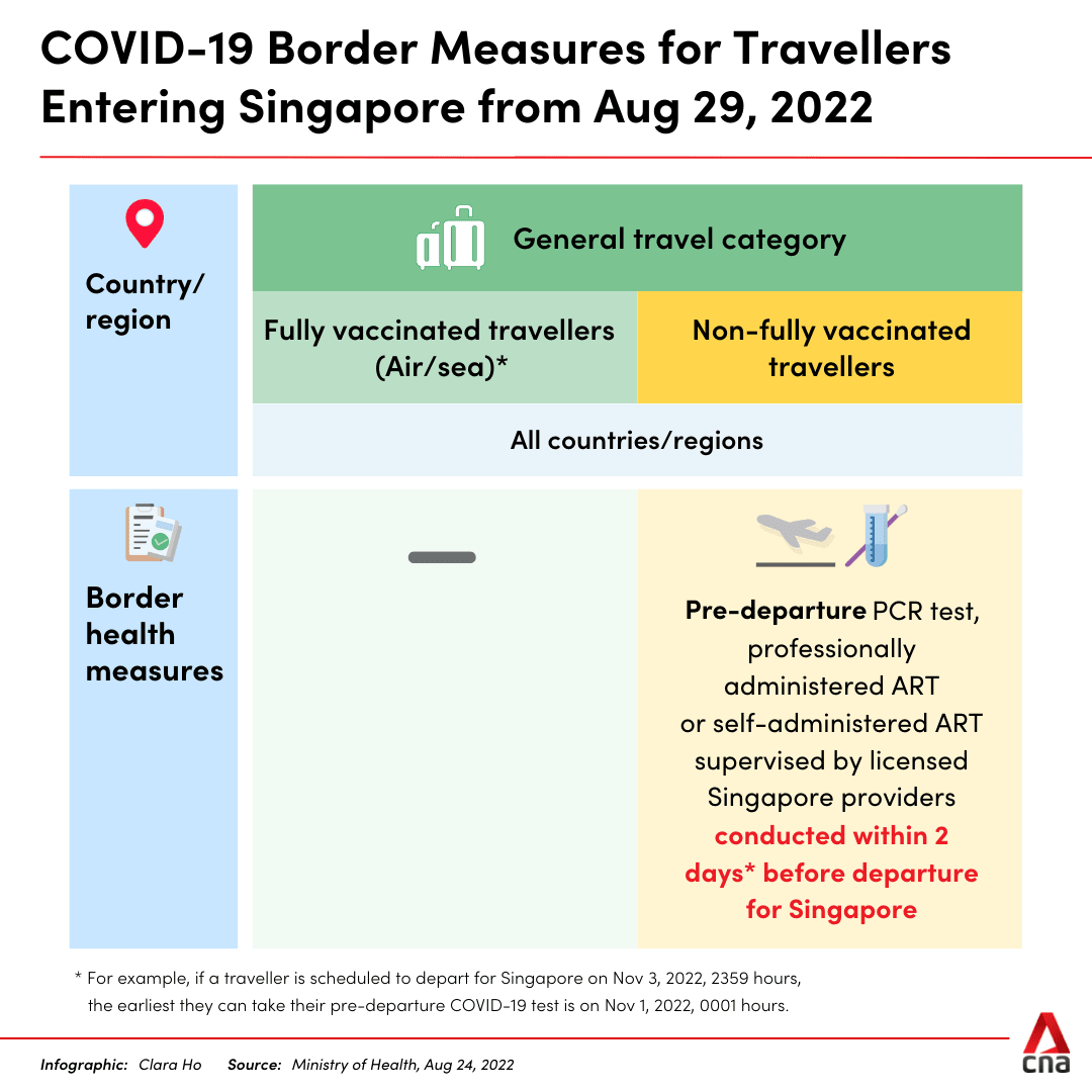 SINGAPORE: Non-fully vaccinated long-term pass holders and short-term visitors aged 13 and above travelling to Singapore from Monday (Aug 29) will no longer need to apply for entry approval, the Ministry of Health (MOH) said in a news release on Wednesday.