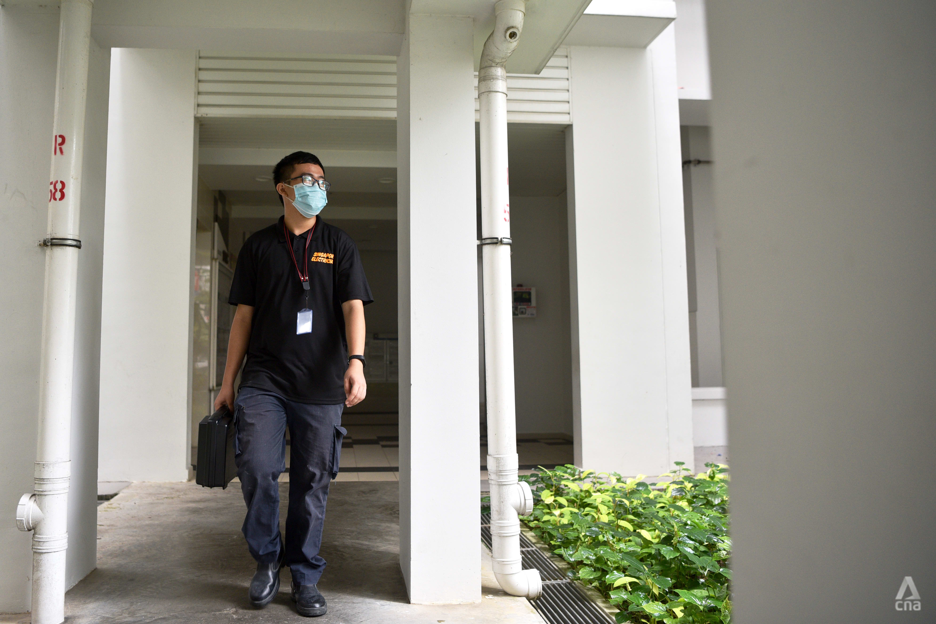 Electrician Confucius Teo is giving intern Poo Chin Yang a briefing at the void deck before heading to a client’s house to fix light switches.