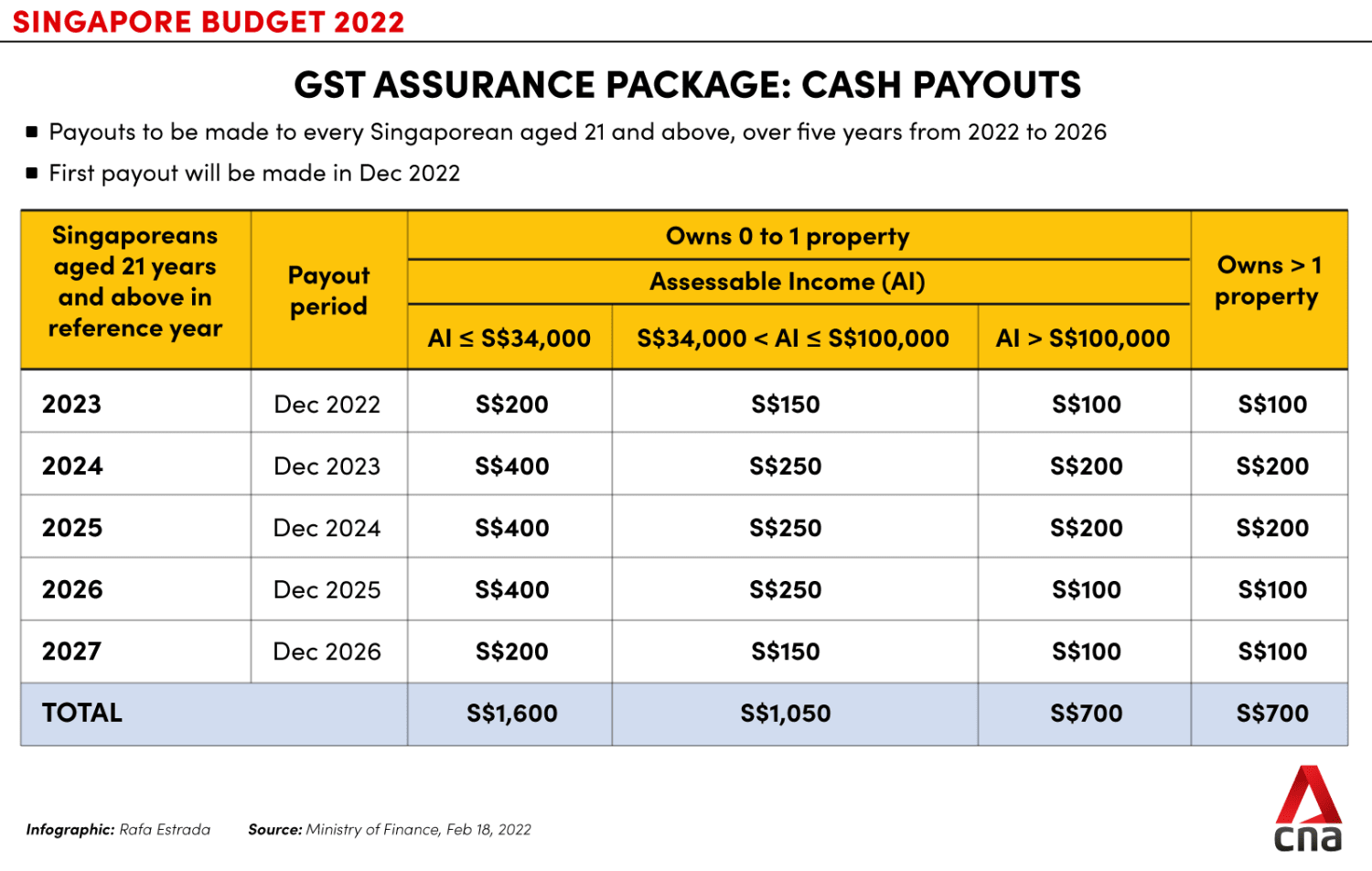 Under the package, every adult Singaporean will get cash payouts of between S$700 and S$1,600, while eligible seniors will get a special GSTV – Cash (Seniors’ Bonus) of between S$600 and S$900.