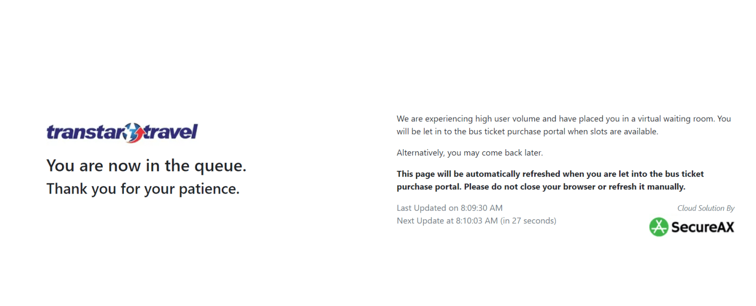 Checks on the Transtar site at about 8am found visitors placed in a queue due to "high user volume".
