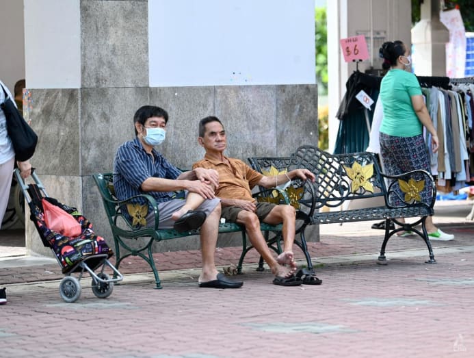 Two man, one without a mask and one with a mask on at AMK Central in Singapore on Mar 29, 2022. (Photo: CNA/Marcus Mark Ramos)