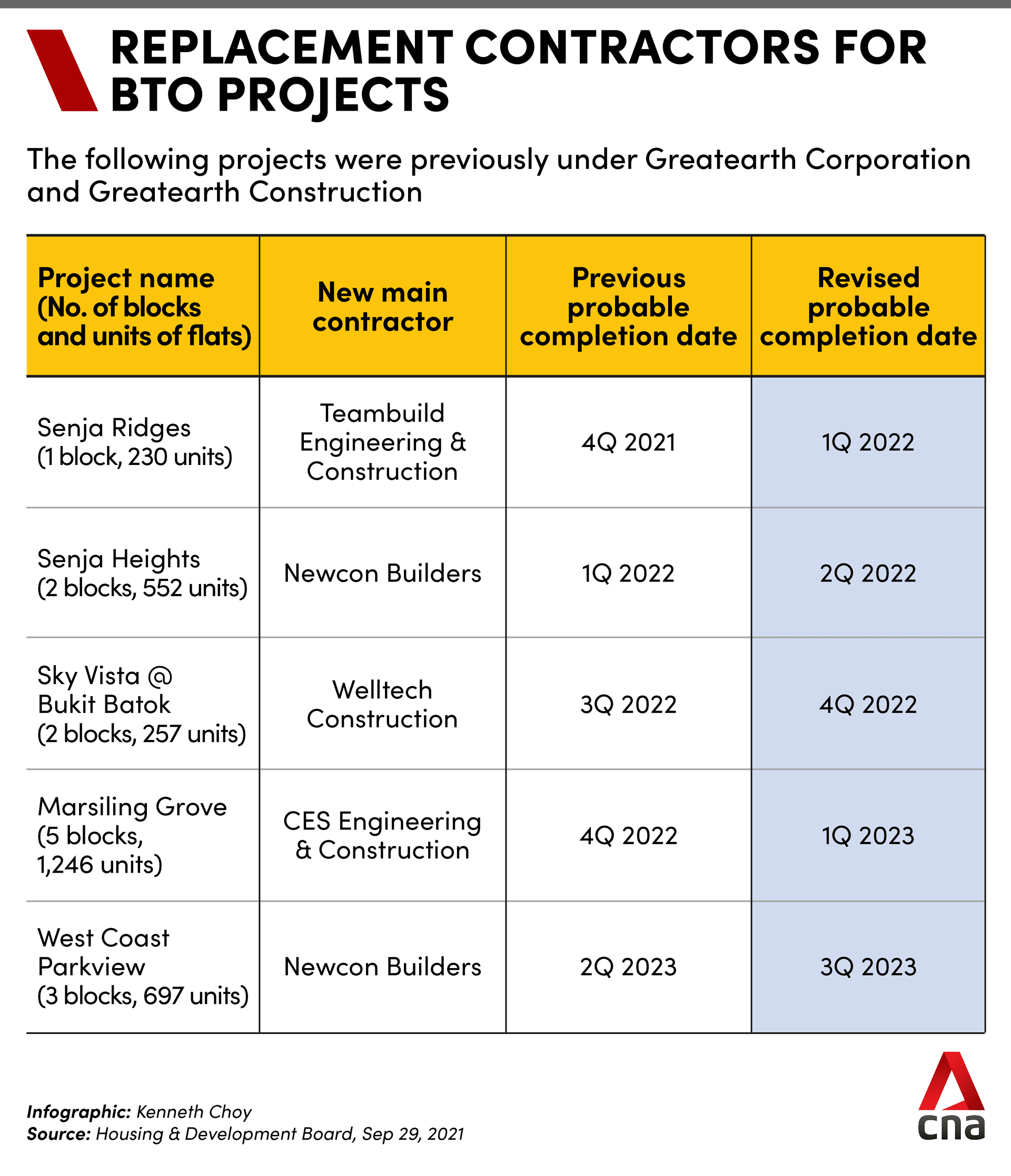HDB said it is now able to "minimise the extent of delays" for flat buyers of the affected housing projects - Senja Ridges, Senja Heights, Sky Vista @ Bukit Batok, Marsiling Grove and West Coast Parkview.
