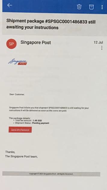 Victims of the latest spate of phishing attacks received fake emails or text messages purportedly sent by delivery companies such as SingPost and DHL.
