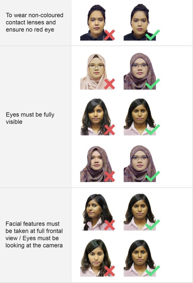 The photo must meet ICA's passport photo requirements, which are based on specifications by the International Standards Organisation (ISO) and the International Civil Aviation Organisation (ICAO).