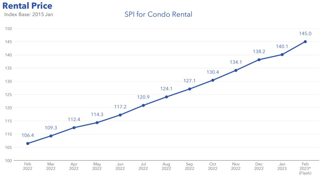 Flash estimates from property portals SRX and 99.co last week said that condo rents went up by 3.5 per cent in February. Year-on-year, condo rents have spiked by 36.2 per cent from February 2022, said the report.