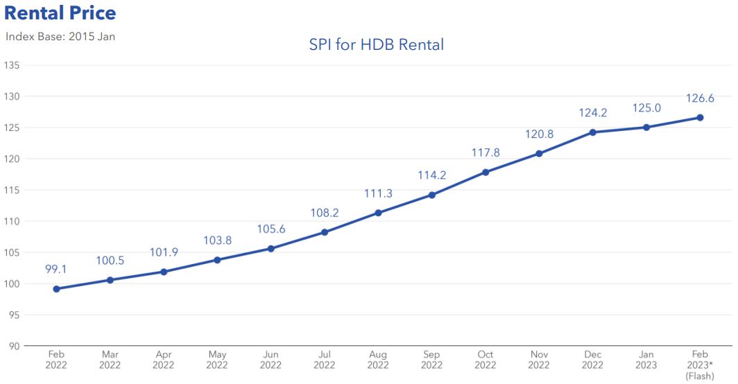 While rents for HDB flats have not stayed still, they remain more affordable. HDB rents increased by 1.2 per cent in February and were up 27.7 per cent year-on-year, said the SRX and 99.co report.