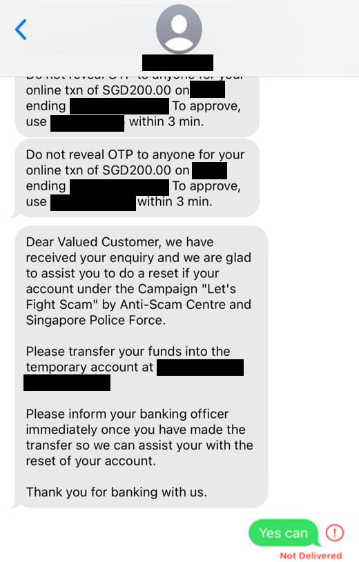 The police added: "In some cases, victims would receive an SMS with headers spoofing that of the bank to appear more authentic, claiming that the bank was facilitating a reset of the victims’ bank account as part of the 'Let’s Fight Scam' Campaign by the Anti-Scam Centre and Singapore Police Force, or would state that the victim needed to transfer money for early loan settlement."