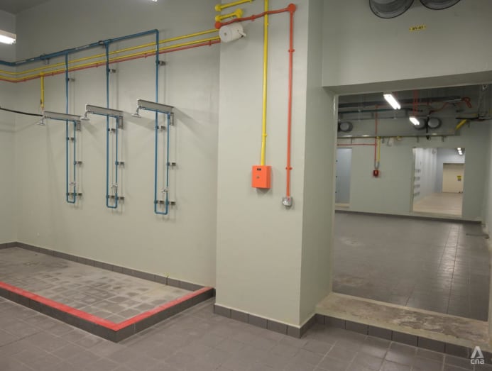 The section, which is usually closed off to the public, also contains a decontamination area resembling open-concept shower stalls. SCDF said that shower stalls would be set up during a real emergency.