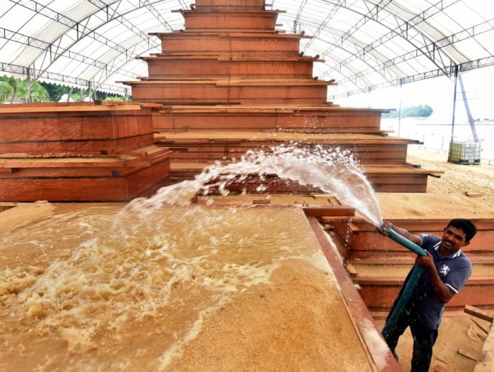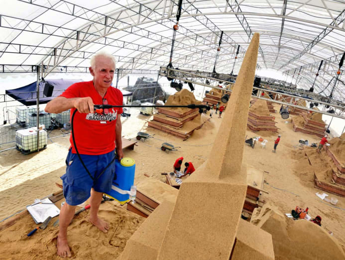 Sand is compacted by machines into massive wooden sand boxes, and hosed down with water to pack the sand down even further. This makes the sand compact and ready for sculpting, Tan told Channel NewsAsia.