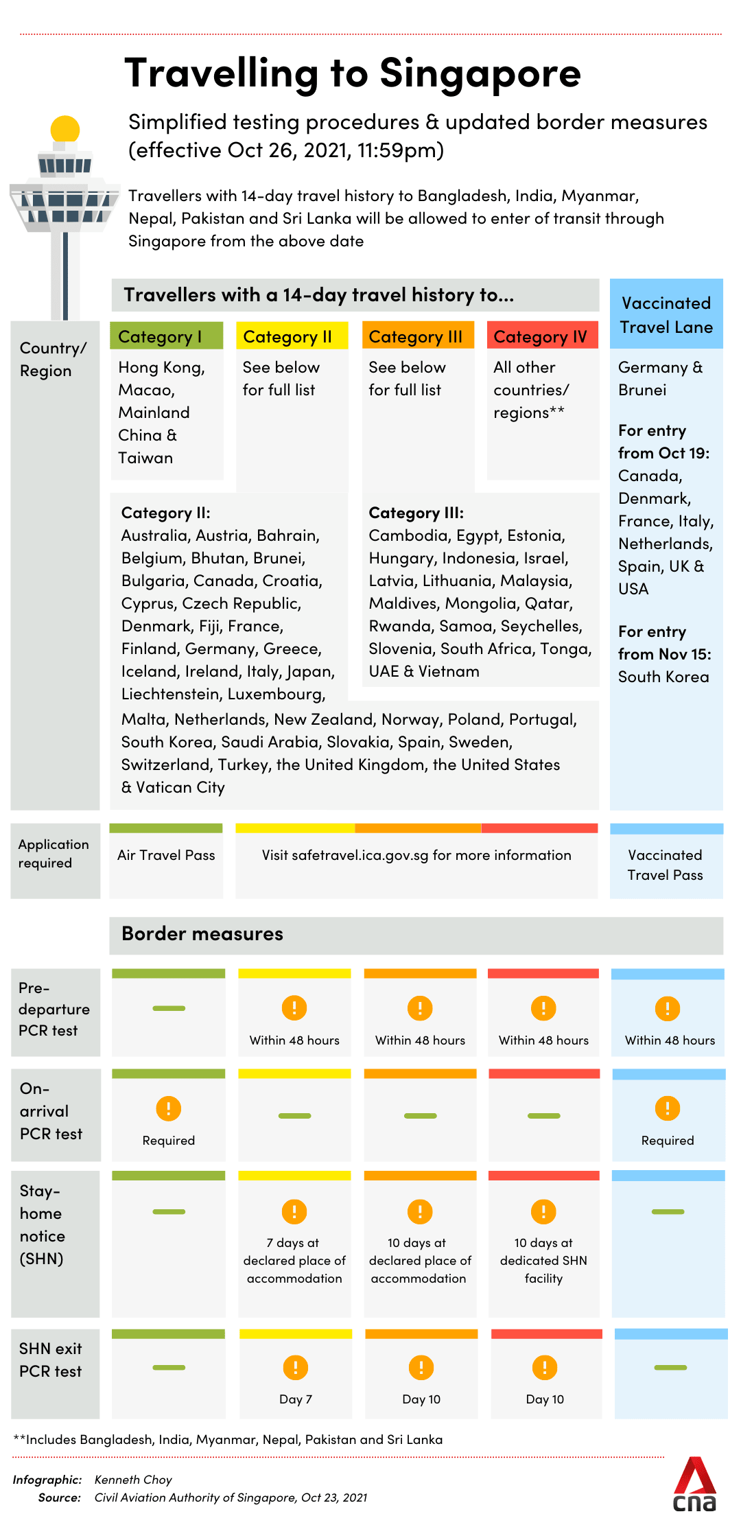 From 11.59pm on Oct 26, travellers (excluding short-term visitors) with a 14-day travel history to Bangladesh, India, Myanmar, Nepal, Pakistan and Sri Lanka, prior to departure to Singapore will be allowed to enter or transit through the country again.