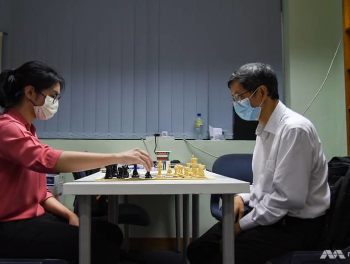 A match between CNA's Cindy Co and Singapore Chess Federation president Christopher Lim. (Photo: Calvin Oh)