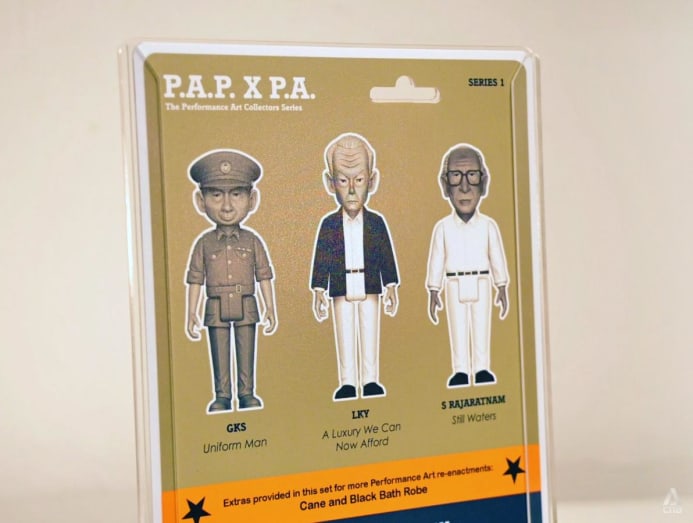 Upon closer inspection, the three toy figurines are striking caricatures of Singapore's founding fathers: Lee Kuan Yew, Goh Keng Swee and S Rajaratnam. Superheroes of a different vintage, some may say.