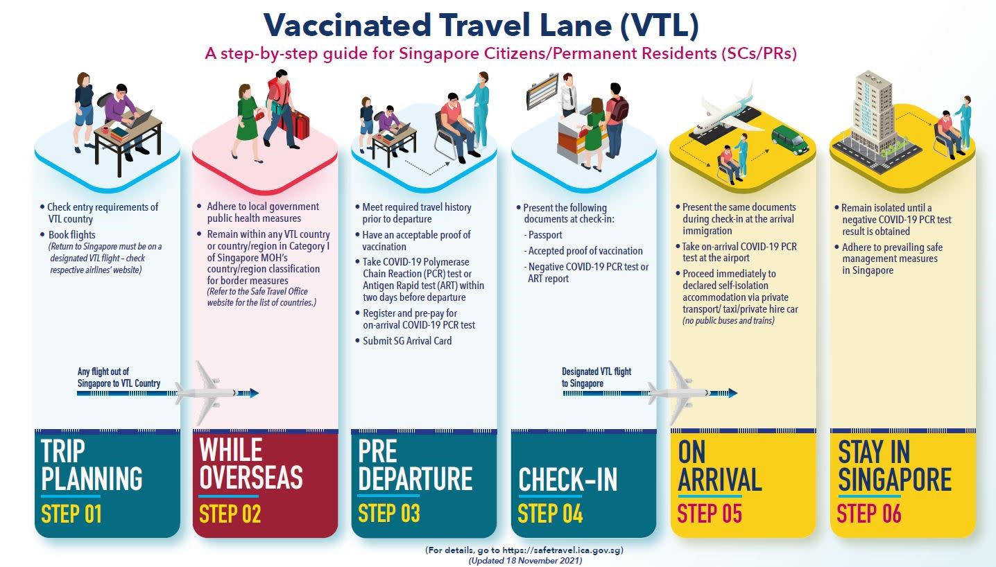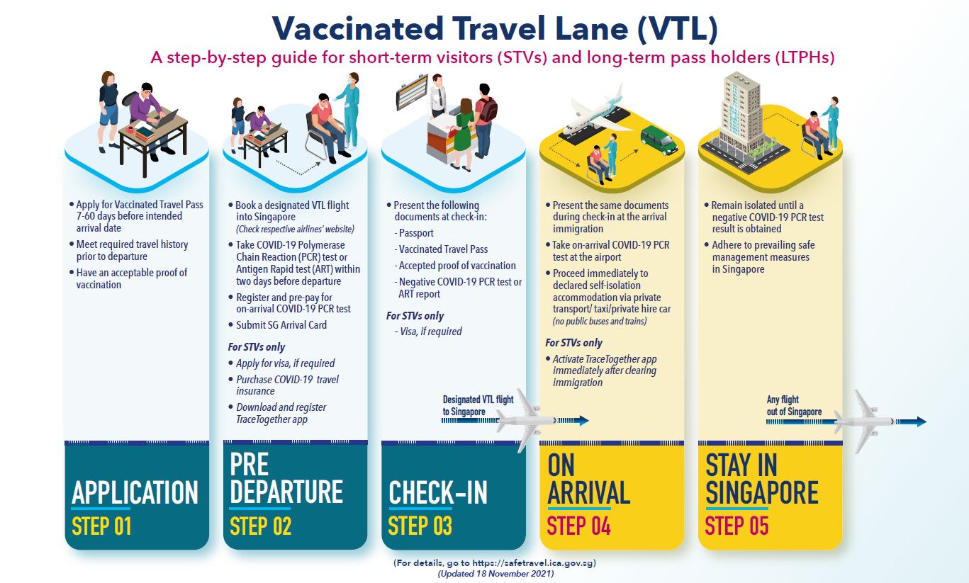 Under the quarantine-free travel scheme, fully vaccinated travellers from VTL countries may enter Singapore without quarantine and just need to undergo COVID-19 testing.