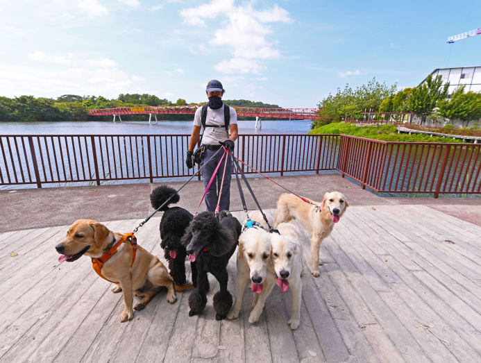 In the same Ponggol Seventeenth Avenue neighbourhood, Joy Chia is busy shepherding her furry "students" into a van used to ferry them for their daily walks.