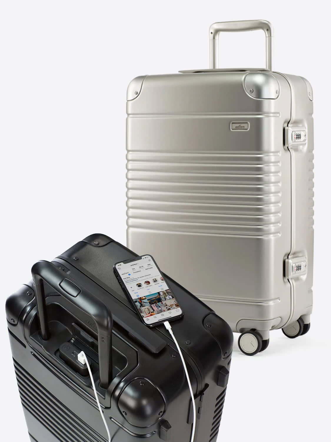 A high-tech piece that comes with an app and Bluetooth smart lock feature so you can remotely unlock and lock your luggage with your phone. Powered by AAA batteries instead of lithium ion, it also comes with a smart handle with an integrated scale. And for added safety, it has an alarm that will alert you when your luggage is a certain distance away from you (especially useful when navigating crowded airports).