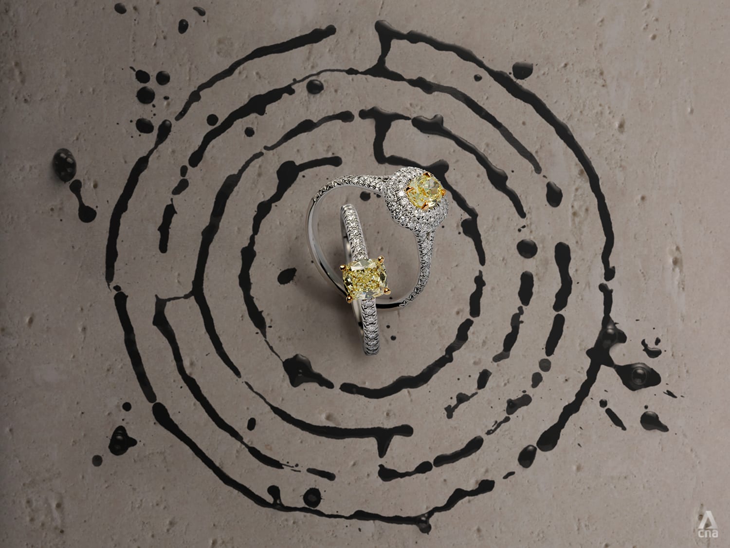 From left: Tiffany Novo® yellow diamond engagement ring; Tiffany Soleste® pear-shaped halo engagement ring; Tiffany Embrace® eternity band in platinum with diamonds; Tiffany Soleste® ring in platinum with an aquamarine center stone and diamonds. (Photo: Kelvin Chia, art direction: Chern Ling)