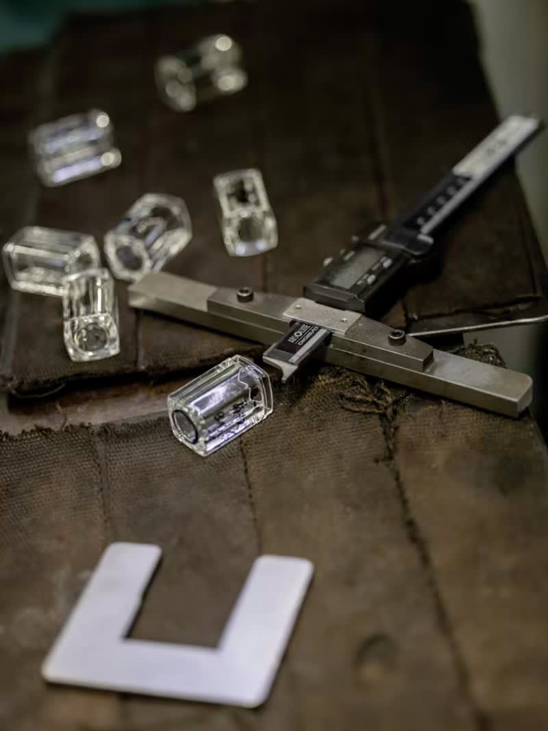 Glassmaking expertise traditionally used in high perfumery was tapped to create a glass case that is faceted like prisms of light – a technical feat that took a Japanese master glassmaker four years to perfect.