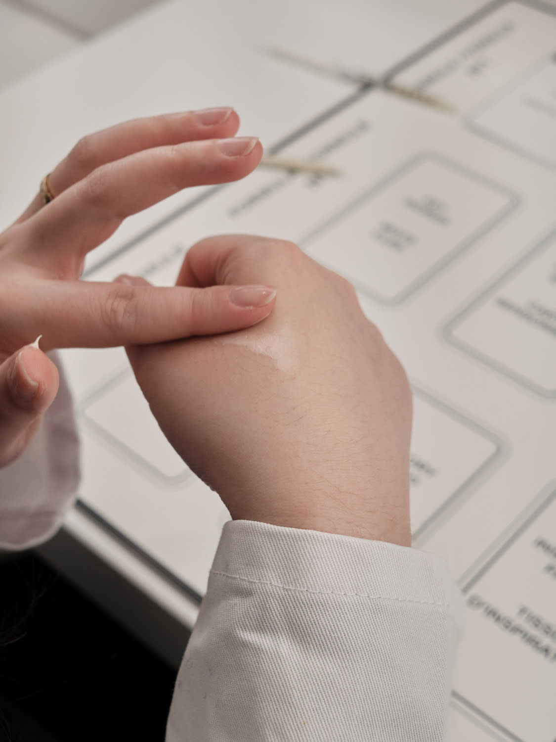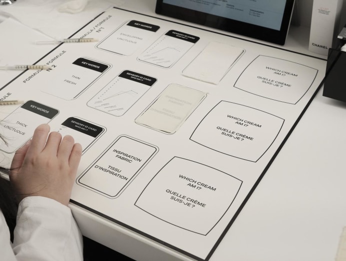 The cards contain keywords meant to describe each cream, such as thin, thick, enveloping and unctuous. The syringes are labelled No 1, No 2 and No 3. I am told to test the creams on my hand, spreading them across my skin and pinching them between my fingers, in order to match the correct product to its correct characteristics.