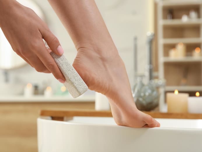 This will slough away dead, dry skin, prevent the skin on heels from thickening and allow moisturisers to penetrate skin and hydrate it more effectively. Once or twice a week, go over your heels with a foot scrub or loofah, and then use a pumice stone to target calluses and areas with extra thick skin. Soaking your feet in warm water for about 15 minutes before you do so will help soften the skin on heels and make it easier to remove dead skin.