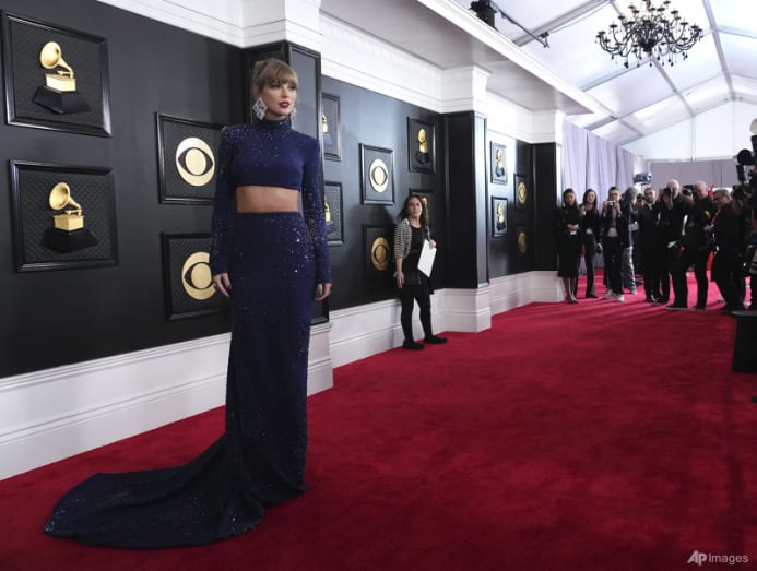 Taylor Swift, perhaps channelling her Midnights era, wore a long two-piece sparkly skirt with a high-neck, long-sleeve crop top, all by Roberto Cavalli. He's one of her favourite designers. It was midnight blue. She added statement diamond earrings by Lorraine Schwartz, her hair in an updo.